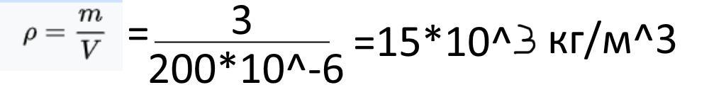 Плотность высчитывается по формуле: масса делённая на объём. Но нам нужно перевести см кубические в единицу СИ - метры кубические. 200*10^-6.