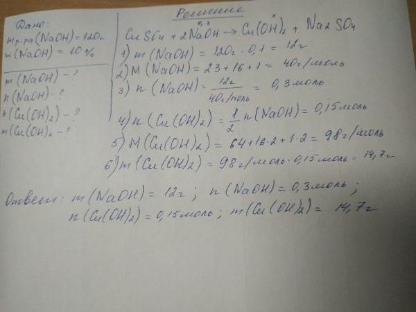 15. Для химической реакции CUSO4 + 2NAOH → Cu (OH) 2 + Na2SO4 к избытку раствора сульфата меди (II) добавляют 120 г 10% -ного раствора гидроксида натрия.