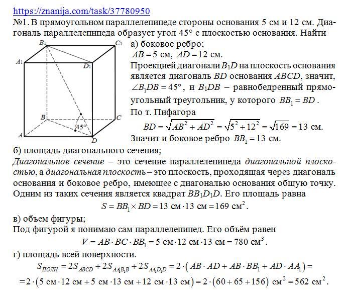 №1. В прямоугольном параллелепипеде стороны основания 5 см и 12 см. Диагональ параллелепипеда образует угол 45°с плоскостью основания. Найти а) боковое ребро б) площадь диагонального сечения. в) объем фигуры г) площадь всей поверхности №2. В прямой призме АВСА1В1С1 основание АВС: АВ=АС=10 см; ВС=12 см; АА1=15 см. Найти а) объем призмы б) площадь сечения, проходящего через точку А1 и противоположную ей сторону нижнего основания