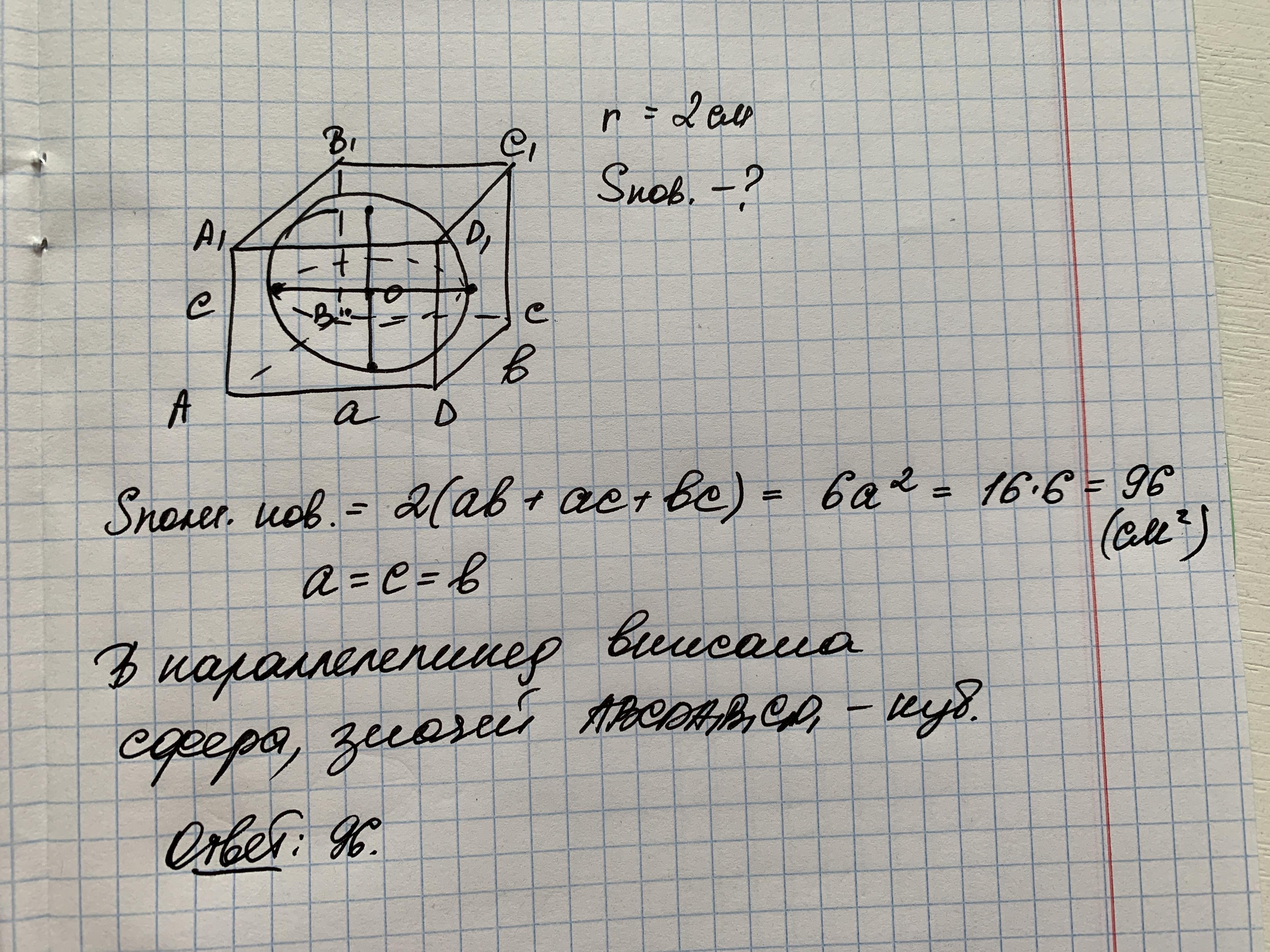 Сфера с радиусом, равным 2см, вписана в прямоугольный параллелепипед. Найти площадь поверхности параллелепипеда