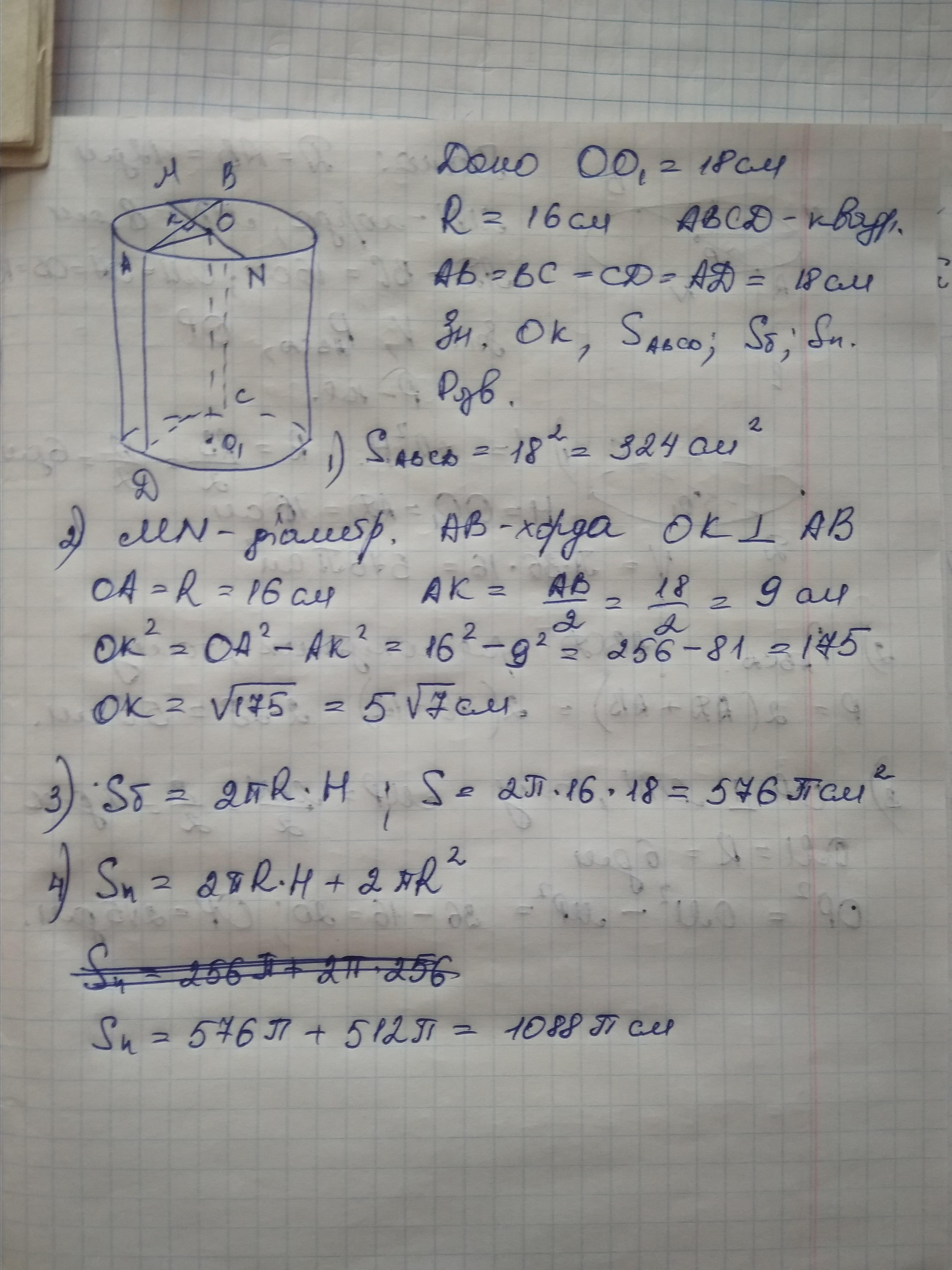 Высота цилиндра равна 18 см, а радиус основания равен 16 см. Цилиндр пересечен плоскостью, параллельной его оси, так, что в сечении получился квадрат. Найдите а) расстояние от оси цилиндра до секущей плоскости, б) площадь сечения, в) площадь боковой и полной поверхности цилиндра