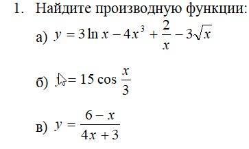 1)\ \ y=3\, lnx-4x^3+\dfrac{2}{x}-3\sqrt{x}\\\\y'=\dfrac{3}{x}-12x^2-\dfrac{2}{x^2}-\dfrac{3}{2\sqrt{x}}\\\\\\2)\ \ y=15\, cos\dfrac{x}{3}\ \ ,\ \ \ \ y'=-\dfrac{15}{3}\, sin\dfrac{x}{3}=-5\, sin\dfrac{x}{3}\\\\\\3)\ \ \ y=\dfrac{6-x}{4x+3}\\\\y'=\dfrac{-(4x+3)-4\cdot (6-x)}{(4x+3)^2}=\dfrac{-27}{(4x+3)^2}