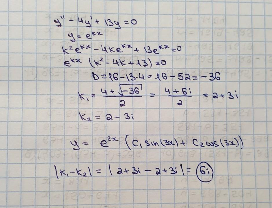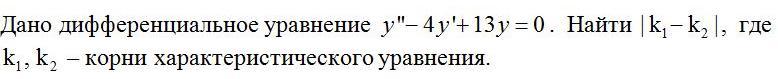 Дано дифференциальное уравнение y''-4y'+13y=0. Найти |k1-k2|, где k1,k2 - корни характеристического уравнения