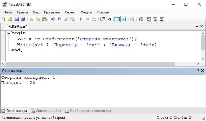 - Write(x>6 ? 'Периметр = '+x*4 : 'Площадь = '+x*x)