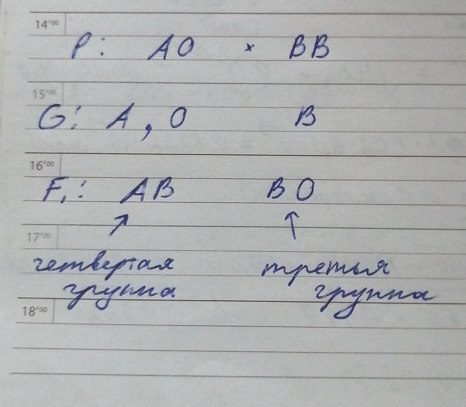 Решите задачу. Родители имеют II (гетерозигота) и III (гомозигота) группы крови. Определите генотипы групп крови родителей. Гаметы. Укажите возможные генотипы и фенотипы (номер) группы крови детей.