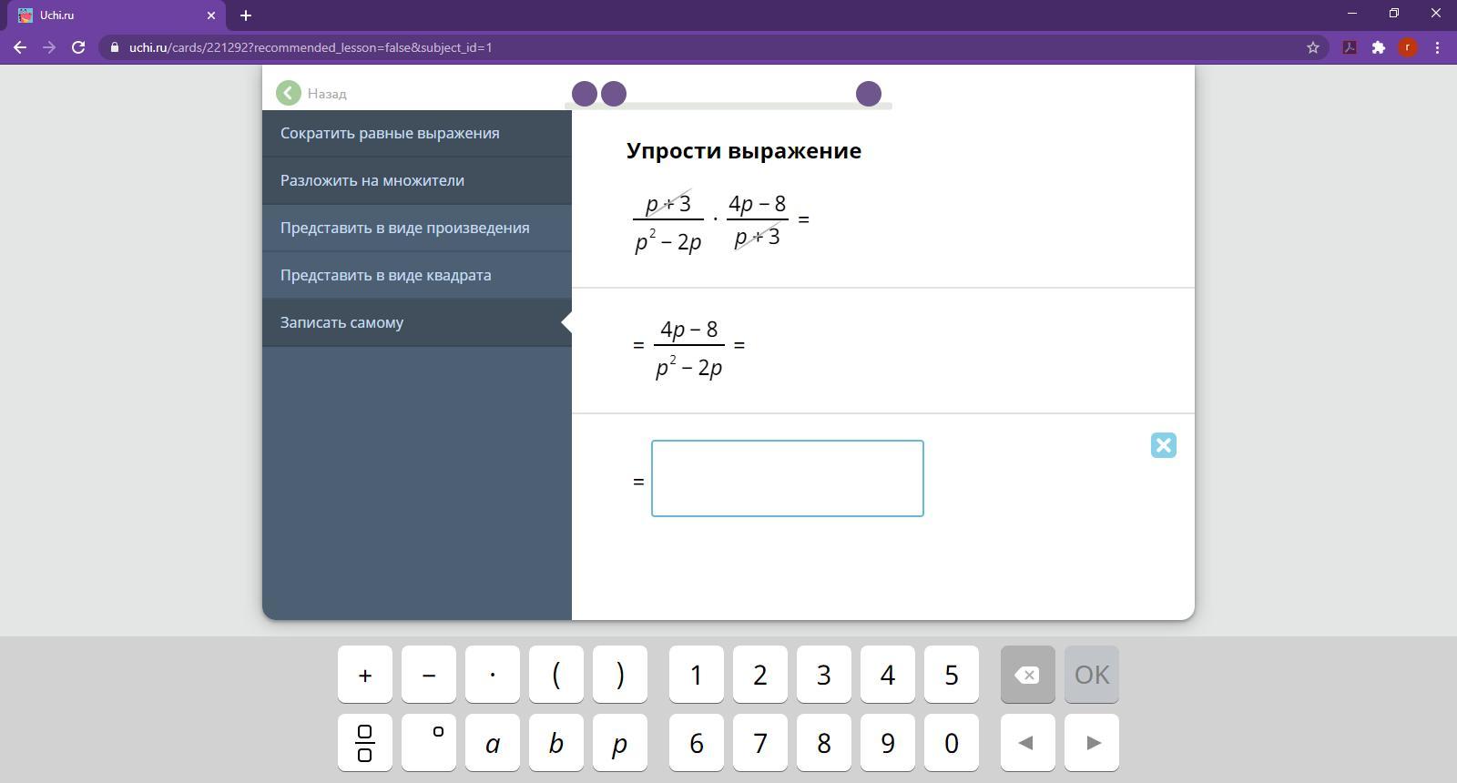 (4p-8)/(p^2-2p)= (4 (p-2))/(p (p-2))= 4/p