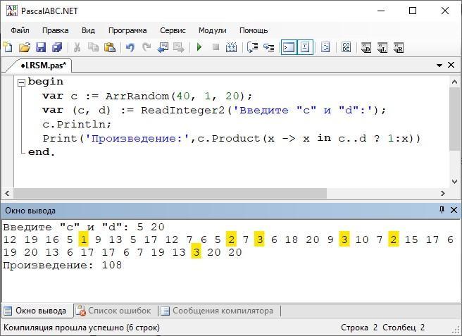 - Print('Произведение:', c.Product(x -> x in с..d ? 1:x))