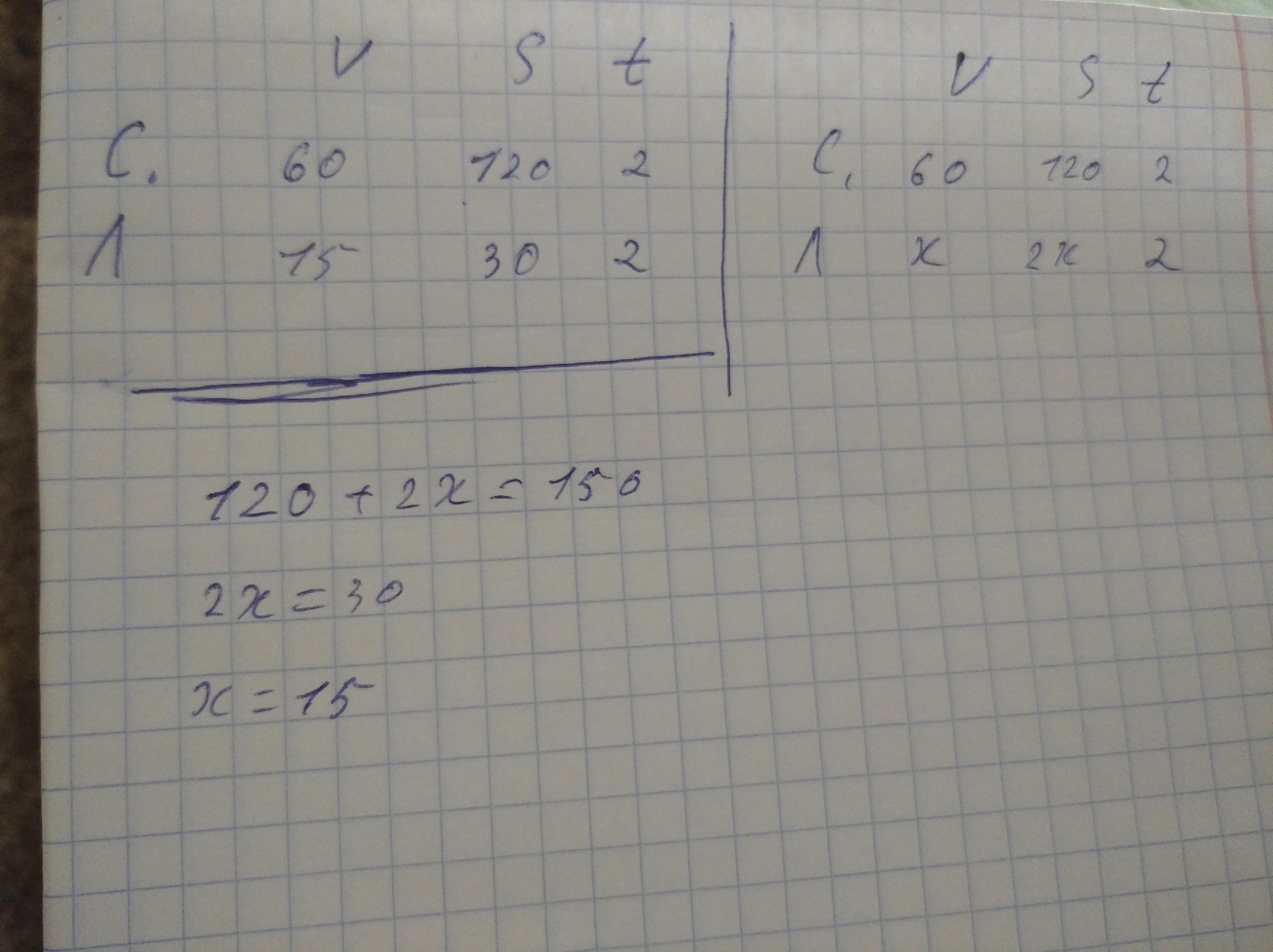 СРОЧНО ПОЖАЛУЙСТА!!!!! Из города в посёлок, расстояние между которыми 150 км, выехали аэросани со скоростью 60 км /ч. В это же время из поселка, навстречу аэросаням, вышел лыжник и встретил аэросани через 2 часа. Найти скорость лыжника. НУЖНО: В форме таблицы оформить условие задачи и решить задачу с помощью уравнения