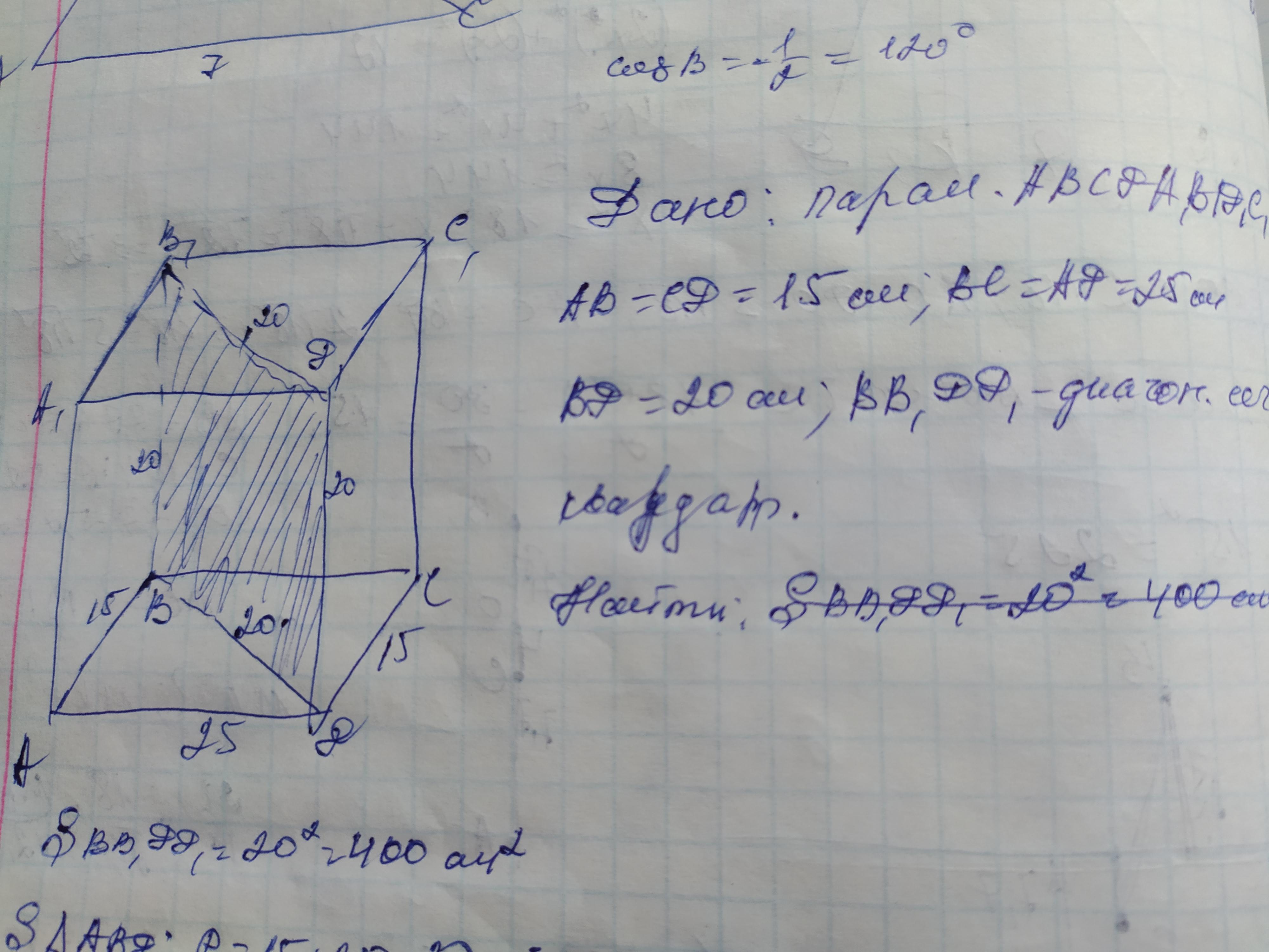 Очень срочно нужно пож. 60б Основания прямого параллелепипеда - параллелограмм со сторонами 15 см и 25 см и диагональю 20 см. Меньшее диагональное сечение параллелепипед - квадрат. чертеж, дано, решение, ответ