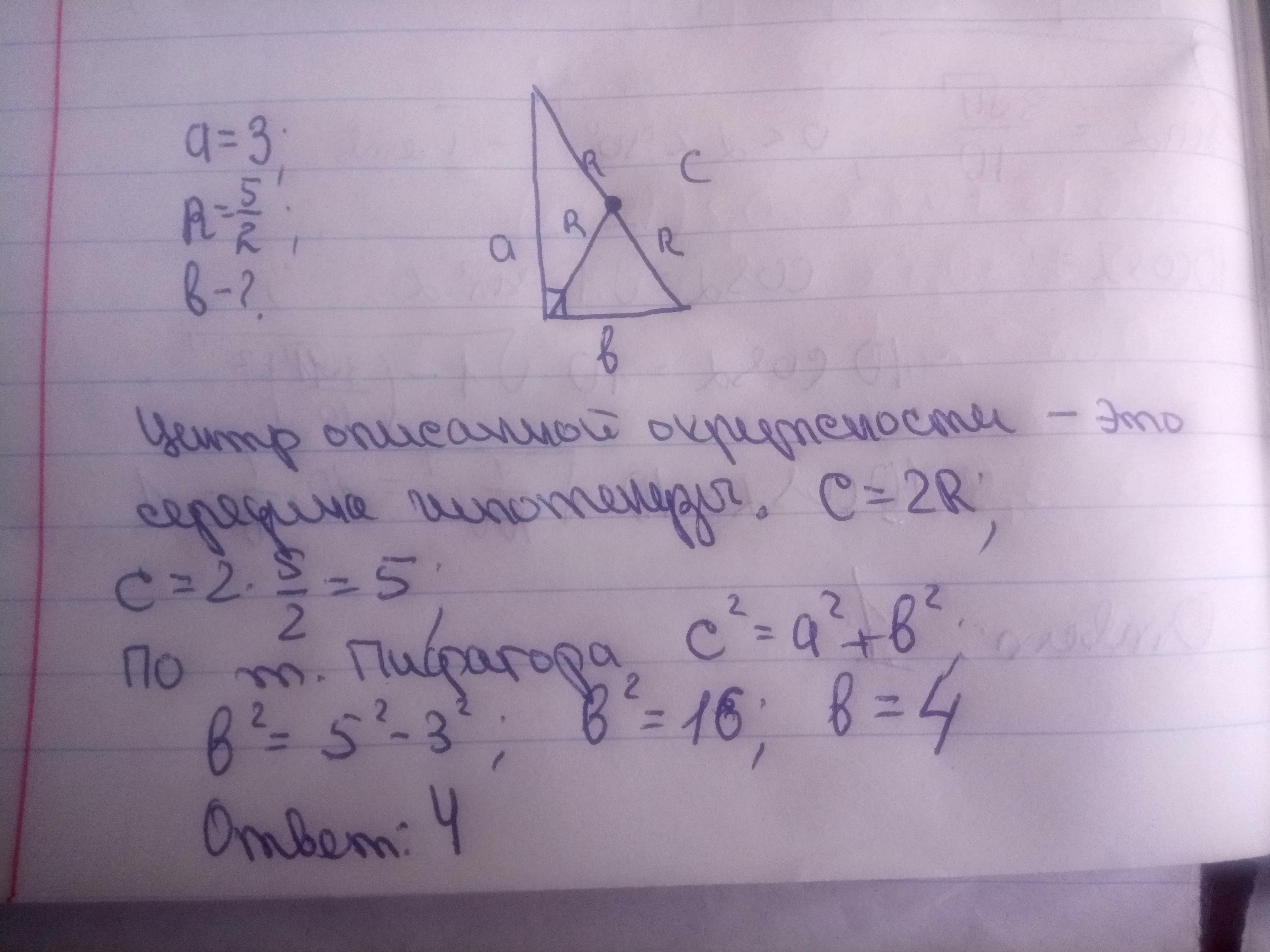 в прямоугольном треугольнике один катет равен 3 радиус описанной окружности R=5/2 Найти другой катет