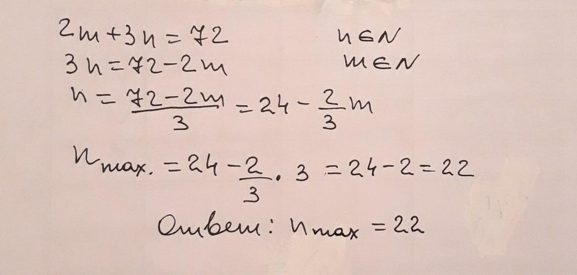 н11 При каком наибольшем значении n выполняется равенство 2m+3n=72 (где m, n натуральные числа) ?