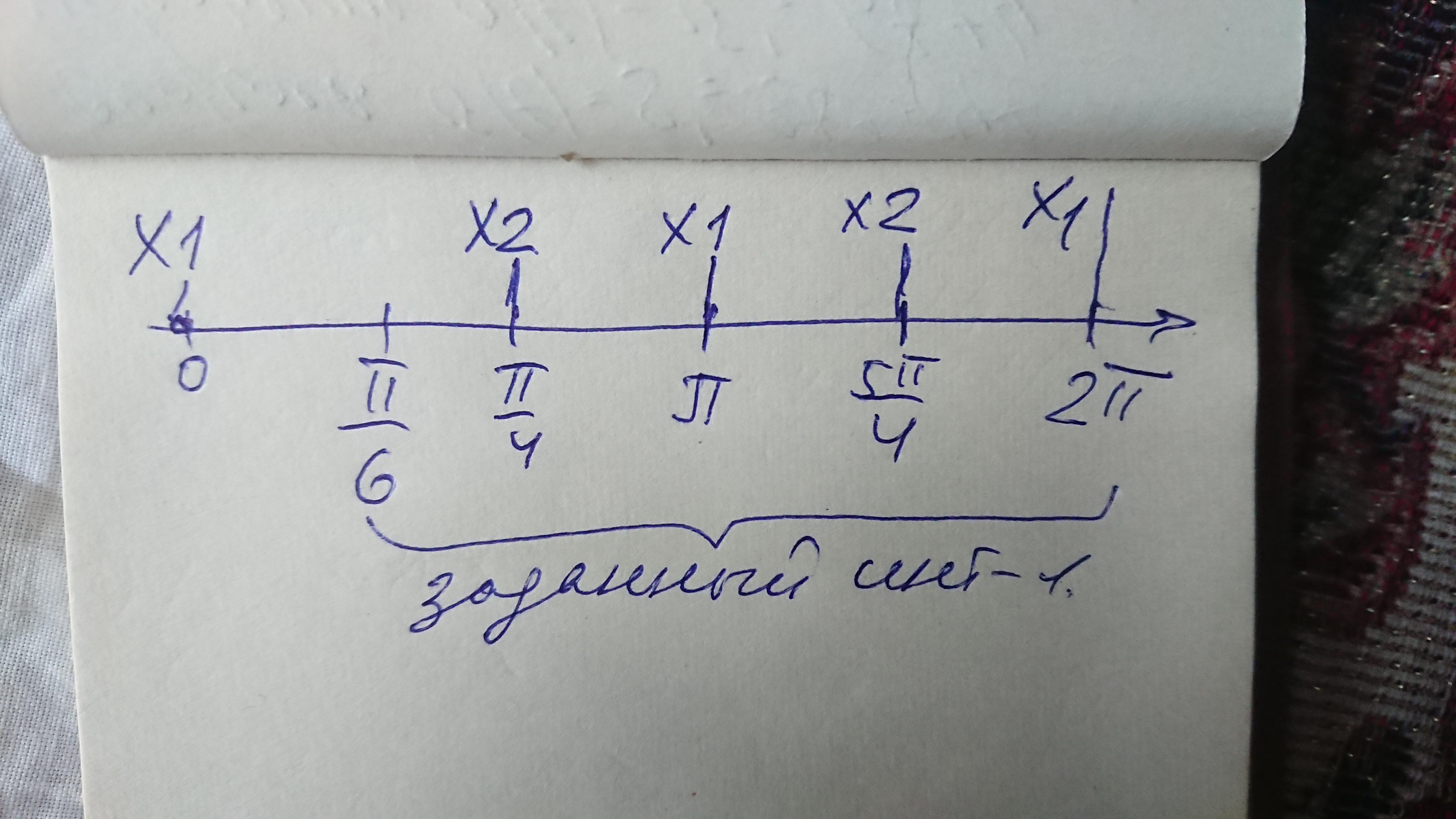 Ответ: х1=0 не входит в интервал, он меньше пи/6. Корни большие 2*пи тоже не войдут в интервал.