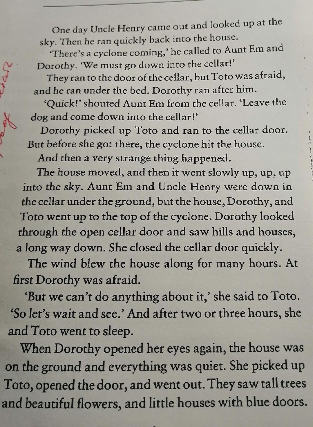 One day Uncle Henry came out and looked up at the sky. Then he ran quickly back into the housc. There's a cyclone coming,' he called to Aunt Em and Dorothy. We must go down into the cellar! They ran to the door of the cellar, but Toto was afraid, and he ran under the bed. Dorothy ran after him. "Quick!" shouted Aunt Em from the cellar.Leave the dog and come down into the cellar! Dorothy picked up Toto and ran to the cellar door. But before she gor there, the cyclone hit the house. And then a very strange thing happened. The house moved, and then it went slowly up, up, up into the sky. Aunt Em and Uncle Henry were down in the cellar under the ground, but the house, Dorothy, and Toto went up to the top of the cyclone. Dorothy looked through che open cellar door and saw hills and houses, a long way down. She closed the cellar door quickly. The wind blew the bouse along for many hours. At first Dorothy was afraid. "But we can't do anything about it,' she said to Toto. "So let's wait and sce.' And after rwo or three hours, she and Toto went to sleep. When Dorothy opened her eyes again, the house was on the ground and everything was quiet. She picked up Toto, opened the door, and went out. They saw tall trees and beautiful flowers, and little houses with blue doors.