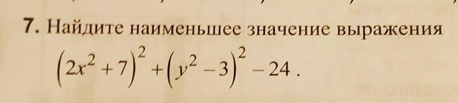 2х² будет наименьшим, если х=0, во всех остальных случаях он будет положительным, тогда квадрат первой скобки равен (0+7)²=49, квадрат второй скобки равен нулю, если у=±√3, в других случаях он будет больше нуля. поэтому наименьшее значение выражения равно 49+0-24=25