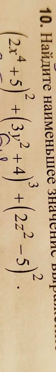 Рассмотрим выражения, стоящие в скобках: в первой скобке 2х⁴+5, наименьшее значение 2х⁴ при х=0, все остальные будут положительны, независимо от х, т.е. наименьшее значение в первой скобке 0+5=5, а квадрат этого выражения равен 5²=5*5=25, аналогично наименьшее значение куба второй скобки равно (0+4)³=4*4*4=64, что касается третьей скобки, то при z=±√2.5 выражение (2z²-5)²=0, и оно будет наименьшим, т.к. все остальные квадраты будут положительными, т.е. больше нуля.