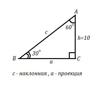 ПОЖАЛУЙСТА СРОЧНО Найти проекцию наклонной и наклонную, если перпендикуляр равен 10, а угол между перпендикуляром и наклонной 60 градусов.