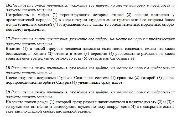 Запятые в предложениях должны стоять под цифрами: 16-1,2,3) - обособлены причастные обороты. 17-1,2,3,4) - обособлены вводные слова. 18-1,4) - обособлено придаточное определительное предложение в СПП. 19-1,2,3,4) - сложное предложение с подчинительной (1,2 - обособлено придаточное определительное предложение) и сочинительной связью (3,4 -вводная конструкция).