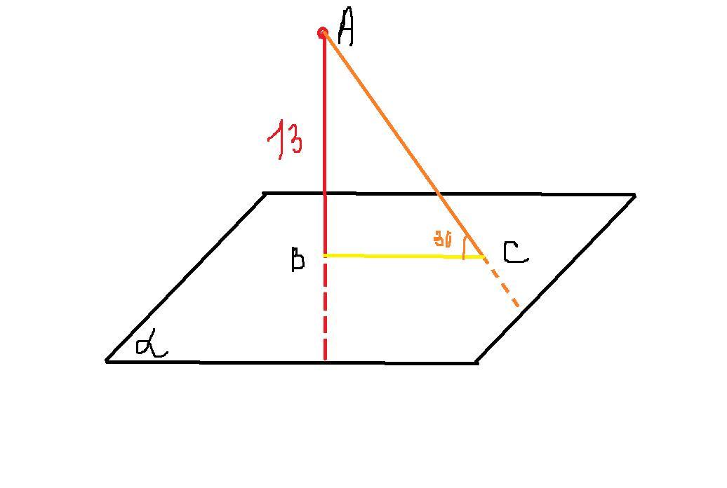 Из точки на плоскость проведены перпендикуляр и наклонная. Длина перпендикуляра равна 13см. Угол между наклонной и плоскостью равен 30°. Найти длину наклонной.