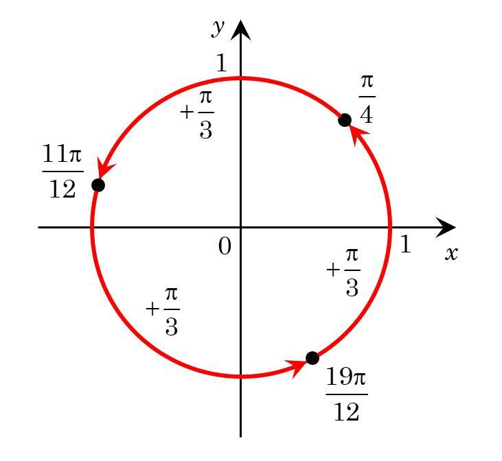 На единичной окружности найдем объединение всех ответов. Заметим, что все три ответа повторяются через треть окружности (см. рисунок), поэтому: