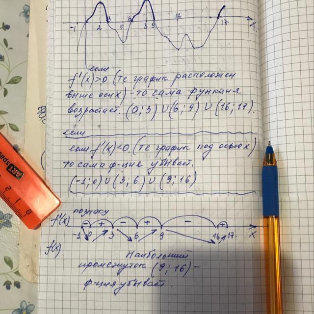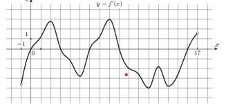 На рисунке изображен график производной функции ƒ(x), определенной на интервале(-1;17). Найдите промежутки убывания функции, в ответе укажите длину наибольшего из них.