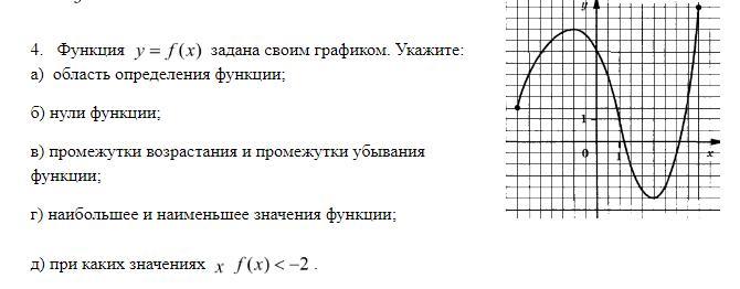 Функция задана своим графиком. Укажите: а) область определения функции; б) нули функции; в) промежутки возрастания и промежутки убывания функции; г) наибольшее и наименьшее значения функции; д) при каких значениях .