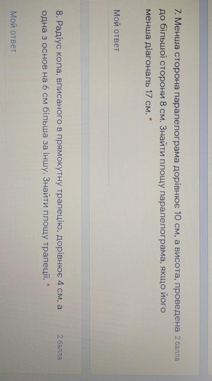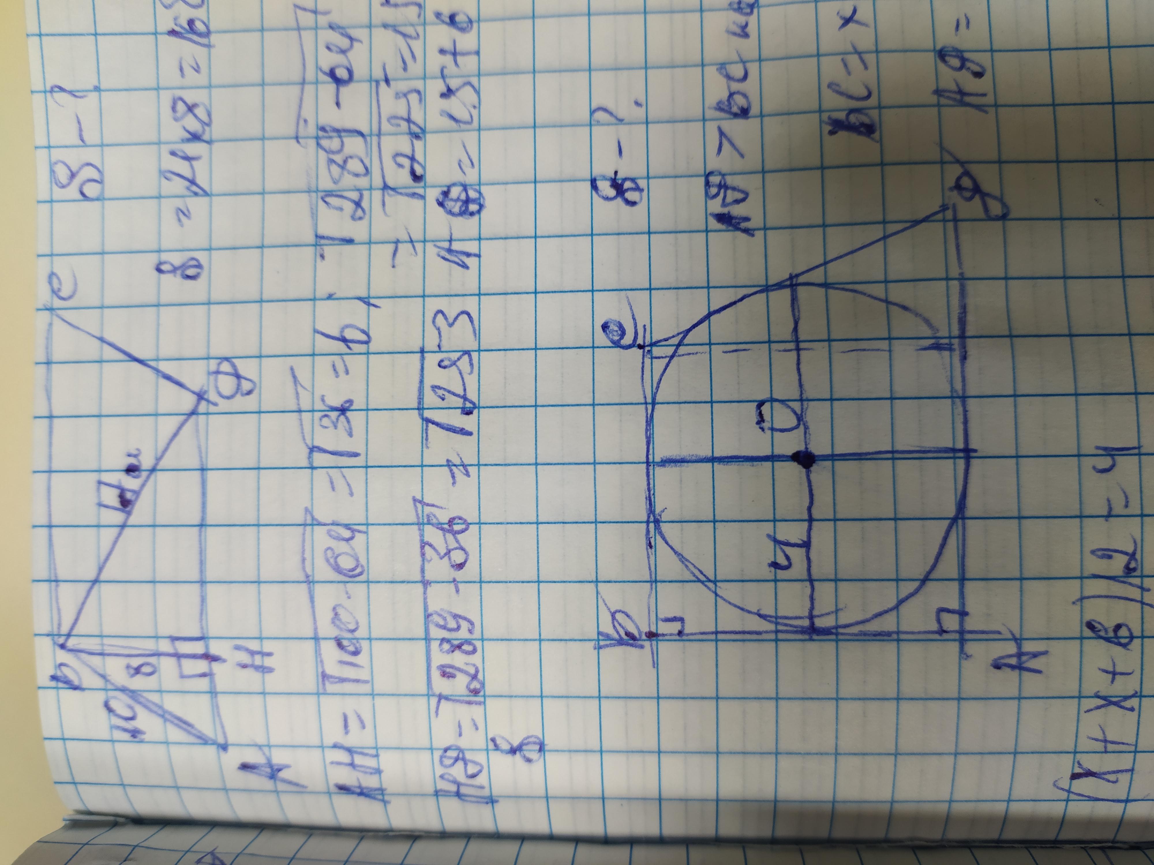 Обозначим вершины трапеции А В С Д, а точки касания К Е Р М. Диаметр окружности= 2×r(радиус)=4×2=8см. АВ=диаметру=8. Следовательно ВК=АК=ВЕ=ОМ=КО=ОР=радиусу=4см. Значит КР-средняя линия трапеции=8см. Средняя линия трапеции равна её высоте и теперь можно найти площадь трапеции зная эти данные по формуле: