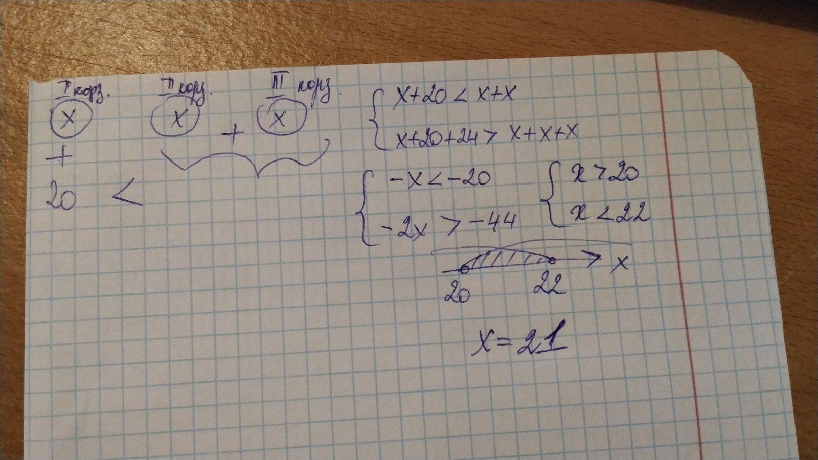 В три корзины положили одинаковое количество яблок. Если в одну из корзин положить ещё 20 яблок, тогда в этой корзине (в которую положили) будет меньше чем в двух других корзинах. Но если добавить ещё 24 яблока , тогда в ней (в которую уже ложили 20 яблок) будет больше чем в трёх корзинах изначально. Сколько яблок было в каждой из корзин изначально ( после того как положили)