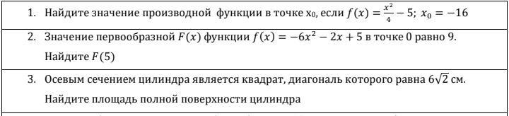 3) Сторона квадрата, которая является лсевым сечением цилиндра, будет равна 6 корней из 2•sin45°=6. Высота цилиндра равна 6, радиус основания 3. Площадь основания равна 9pi, площадь боковой поверхности равна 6pi•6=36pi.Тогда площвдь полной поверхности составит: