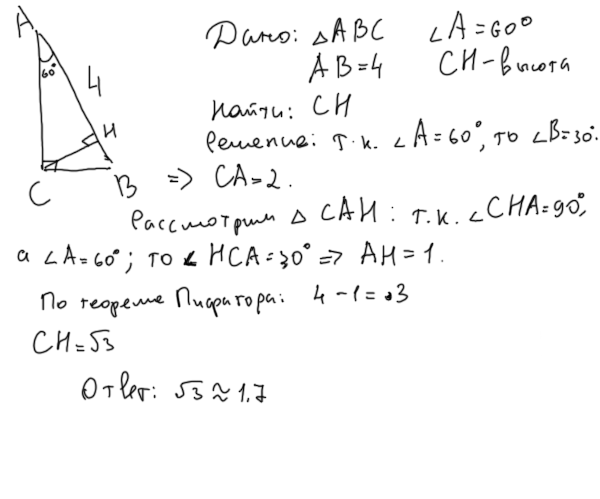 в треугольнике ABC угол C равен 90 градусов, CH- высота, угол A равен 60 градусов, AB=4. найти AH