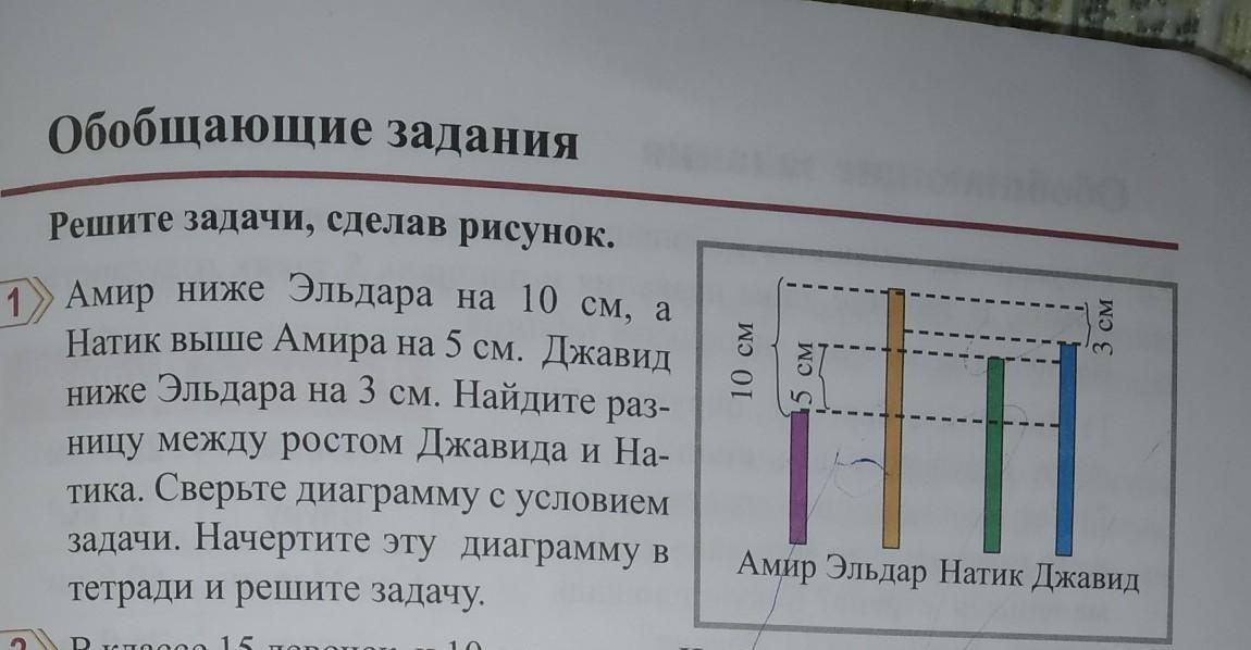 Если смотреть на график, то сразу понятно, что разница между ростом Джавида и Натика является разницой между самой большой разницой (10см) и суммой других разниц (5см+3см). Тоесть разница между Джавидом и Натиком составляет 10-(5+3)=10-8=2 см