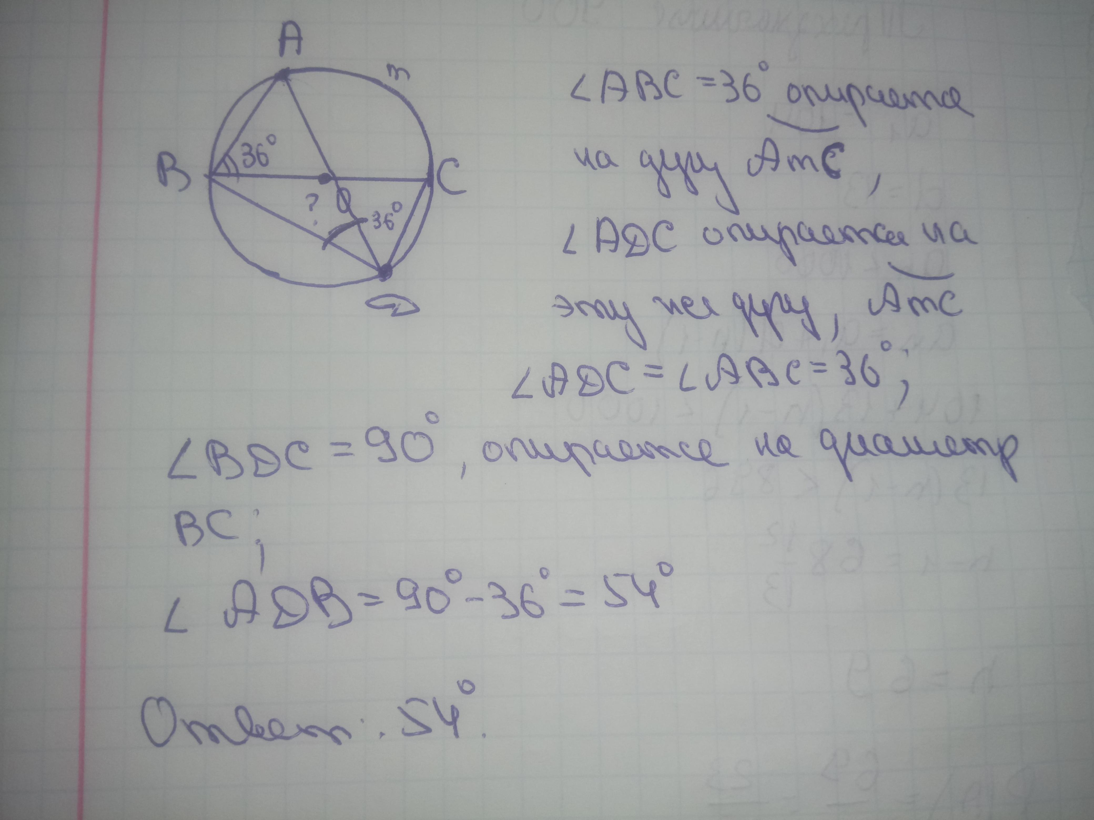 BC- диаметр окружности с центром в точке О, AB и CD -хорды этой окружности . Угол ABC =36. Найдите угол ADB