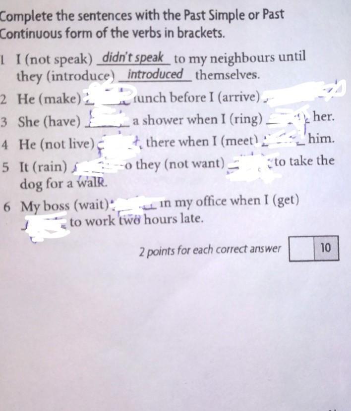 6 My boss (was waiting) -in my office when I (got) to work two hours late.