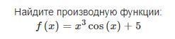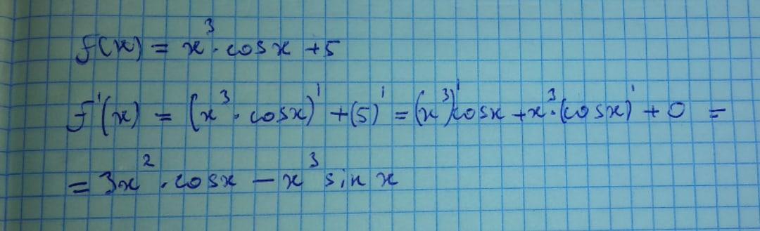 f'(x)=(x³*cosx+5)'=(x³)'*cosx+x³*(cosx)'+5'=3x²*cosx-x³*sinx