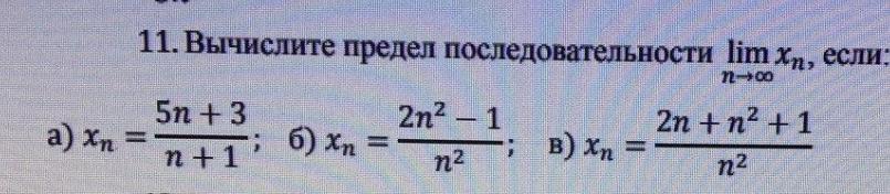 Разберем Ваш пример. а) Числитель 5n+3 - стандартный вид многочлена, показатель степени старшего члена 5n=5n¹ равен 1. Знаменатель n+1 - стандартный вид многочлена, показатель степени старшего члена n=n¹ равен 1. показатель числителя равен показателю знаменателя⇒ коэффициент числителя 5n равен 5, коэффициент знаменателя n=1n равен 1, делим коэффициент числителя на коэффициент знаменателя.5/1=5.