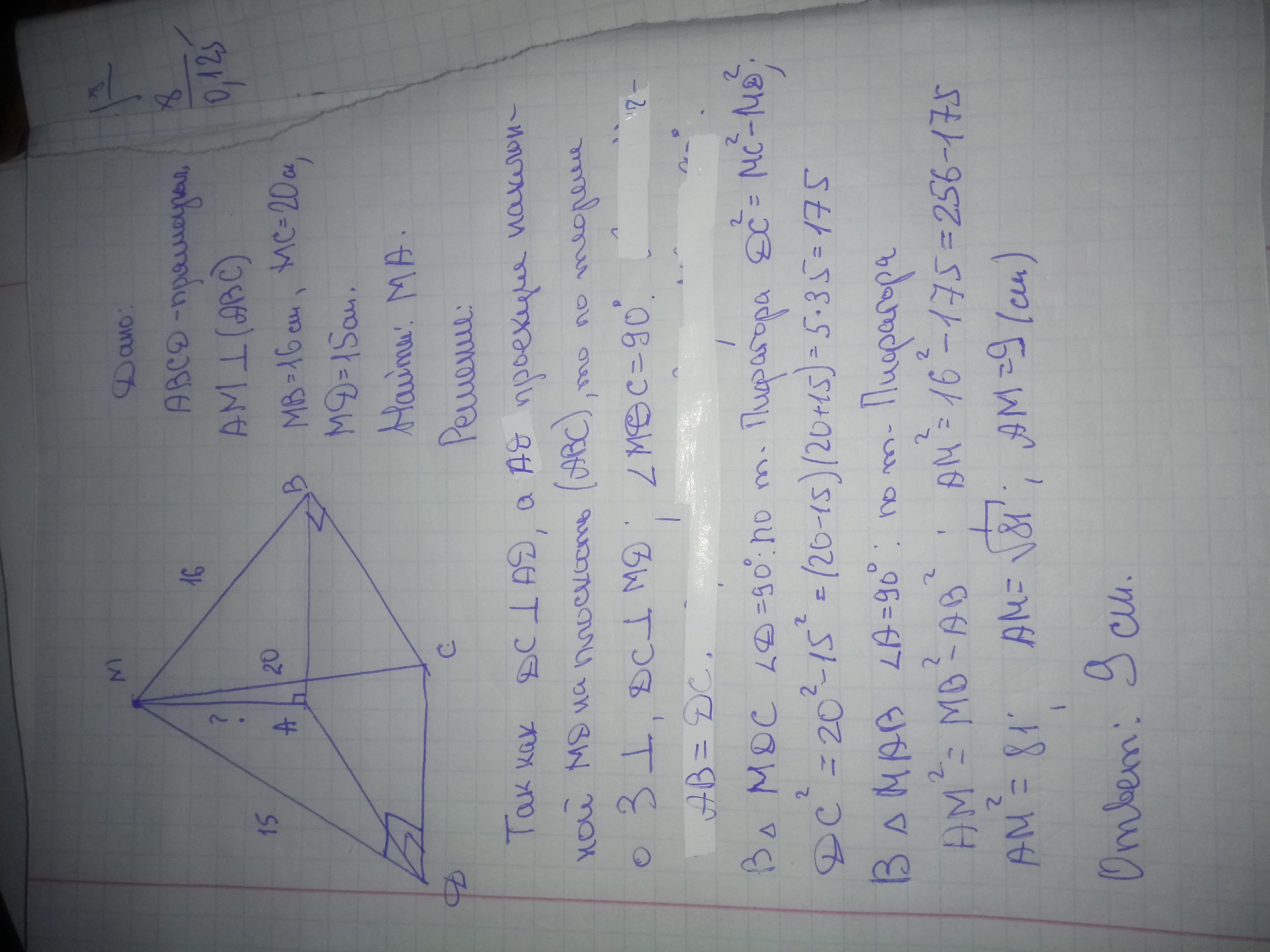 Помогите пж 1) Из вершины А прямоугольника АВСД к его плоскости проведен перпендикуляр АМ. Вычислите длину этого перпендикуляра, если МВ=16 см, МС=20см, МД=15см.