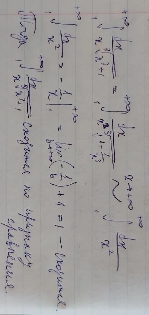 Решение на фото. Сначала выносим из-под корня икс, затем смотрим, чему эквивалентен интеграл при х -> +оо. Решаем эквивалентный интеграл и получаем конечное число. Значит эквивалентный интеграл сходится. Тогда, по признаку сравнения, сходится и данный интеграл.