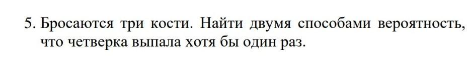 Вероятность выпадения на одной кости четверки равна 1/6, а не выпадения на трех (1-1/6)*(1-1/6)*(1-1/6)=125/216, вероятность же выпадения ХОТЯ БЫ один раз четверки равна 1-125/216=91/216