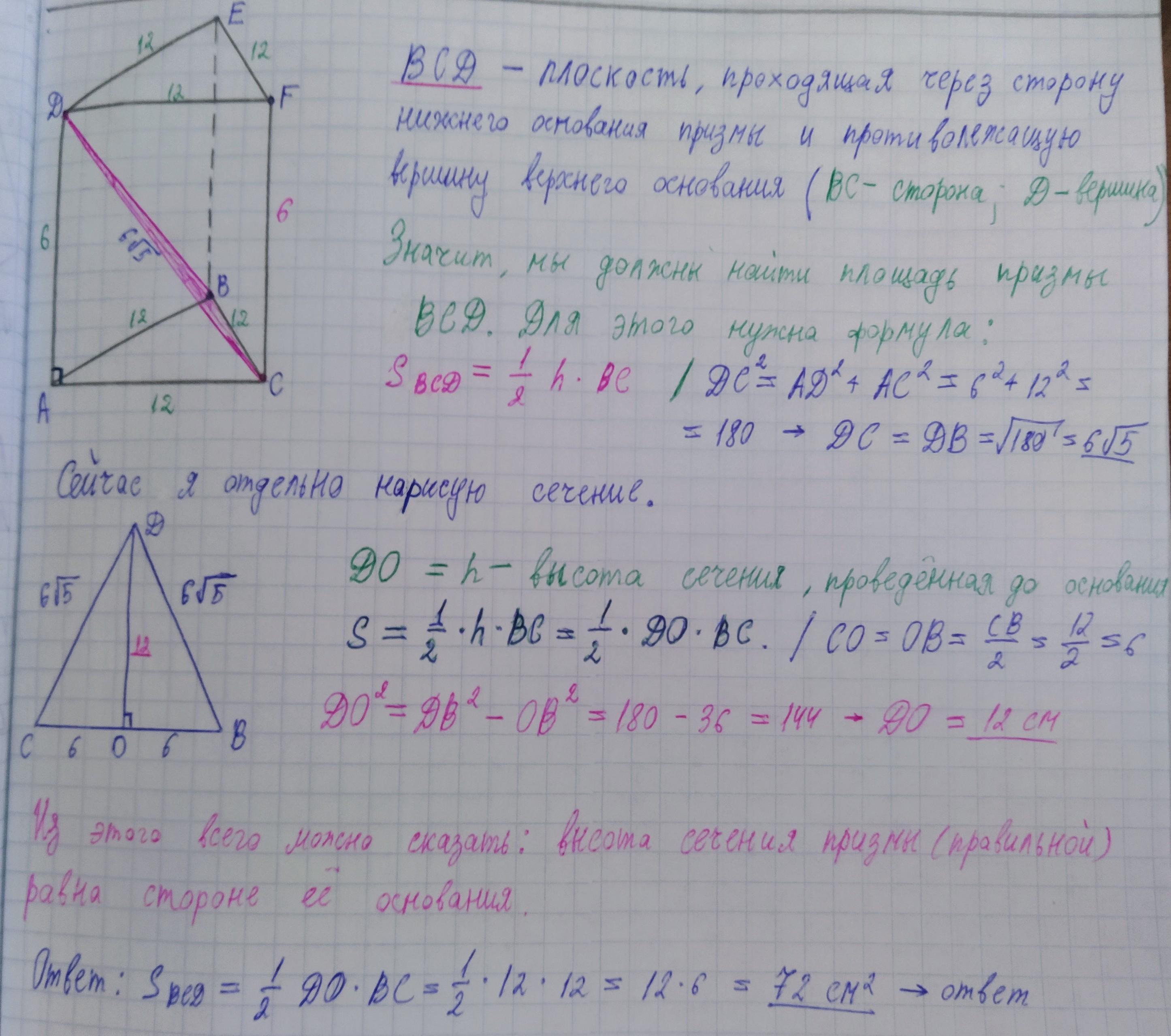 9. Решите задачу: Сторона основания правильной треугольной призмы равна 12 см, а высота призмы 6 см. Найдите площадь сечения этой призмы плоскостью, проходящей через сторону нижнего основания и противолежащую вершину верхнего основания призмы.