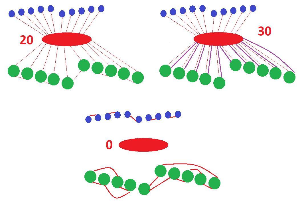 Например, если каждый малый и средний город соединены со столицей, а средние города по парам между собой, то из столицы будет выходить 20 дорог.