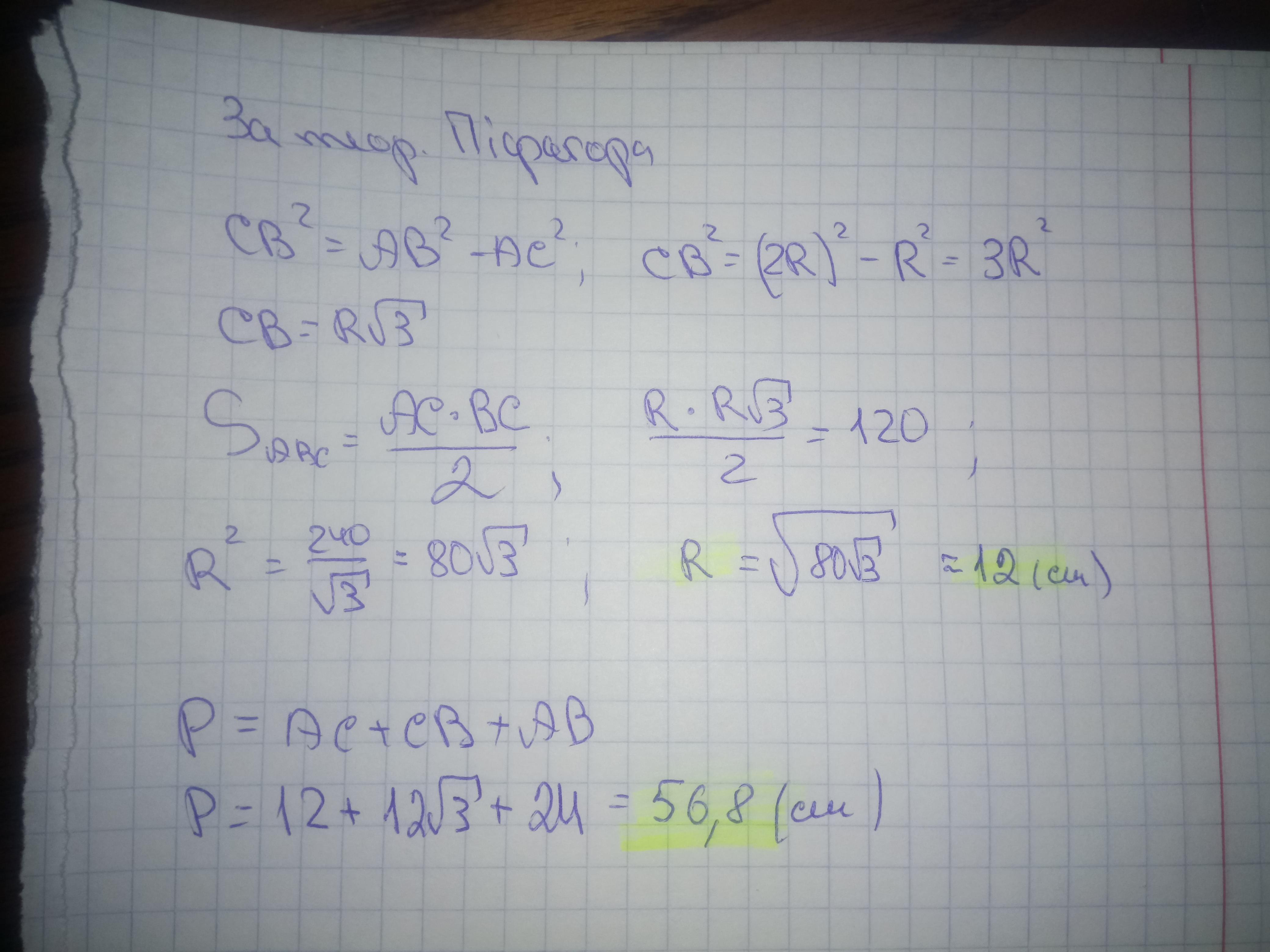 навколо нього кола, якщо його площа дорівнює 120 см, а гострий кут 60°.