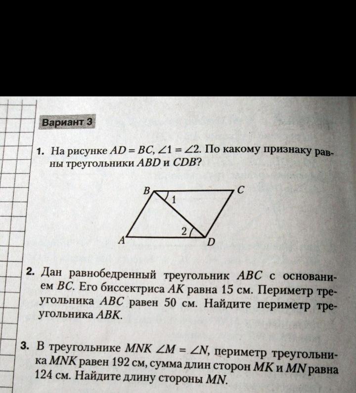 1. по первому признаку равны эти треугольники, у них BD- общая, AD=BC по условию, ∠1=∠2 по условию.