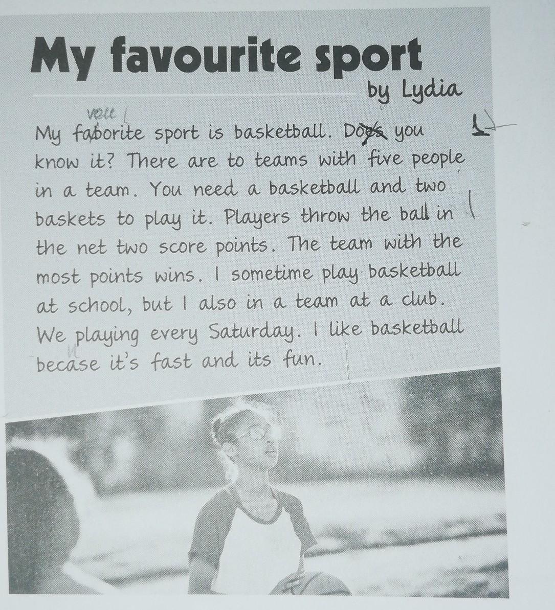 My favourite sport is basketball. Do you know it? There are two teams with five peoples in the team. You need a basketball and two baskets to play it. The players throw the ball in the net and have two score points. The team with the most points win. I sometimes play basketball at school, but I am also in a team at a club. We are playing every Saturday. I like basketball because it's fast and its fun.
