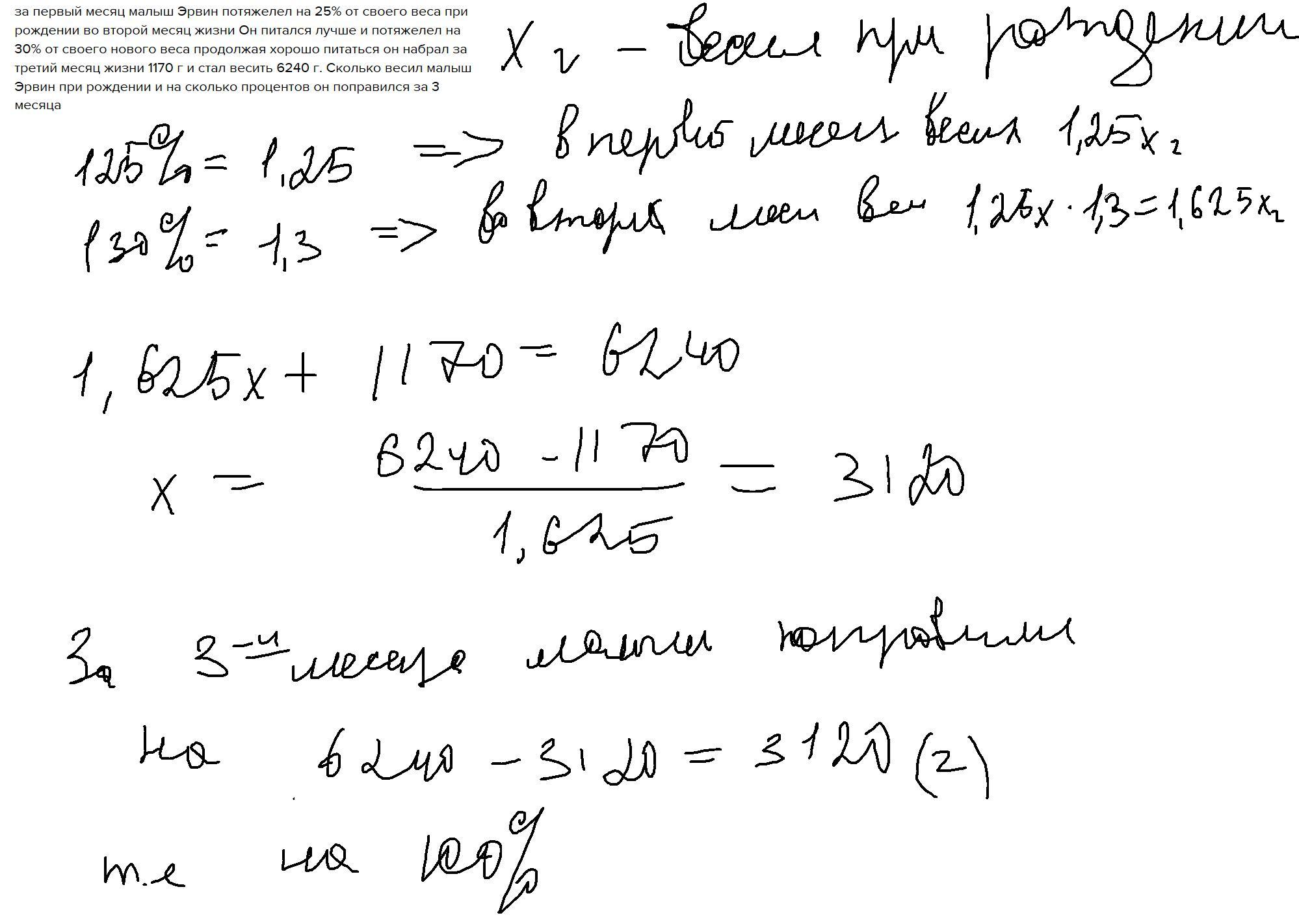 за первый месяц малыш Эрвин потяжелел на 25% от своего веса при рождении во второй месяц жизни Он питался лучше и потяжелел на 30% от своего нового веса продолжая хорошо питаться он набрал за третий месяц жизни 1170 г и стал весить 6240 г. Сколько весил малыш Эрвин при рождении и на сколько процентов он поправился за 3 месяца