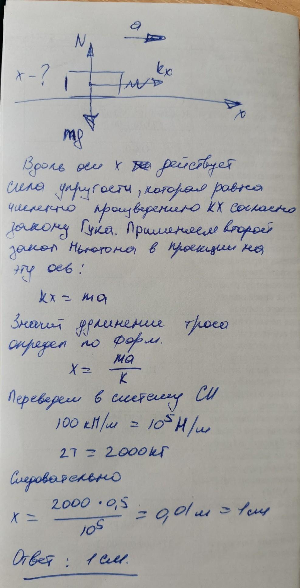 47. Найти абсолютное удлинение троса с коэффициентом жесткости 100кН/м при буксировке автомобиля массой 2т с ускорением 0,5м/с2. помогите срочно !