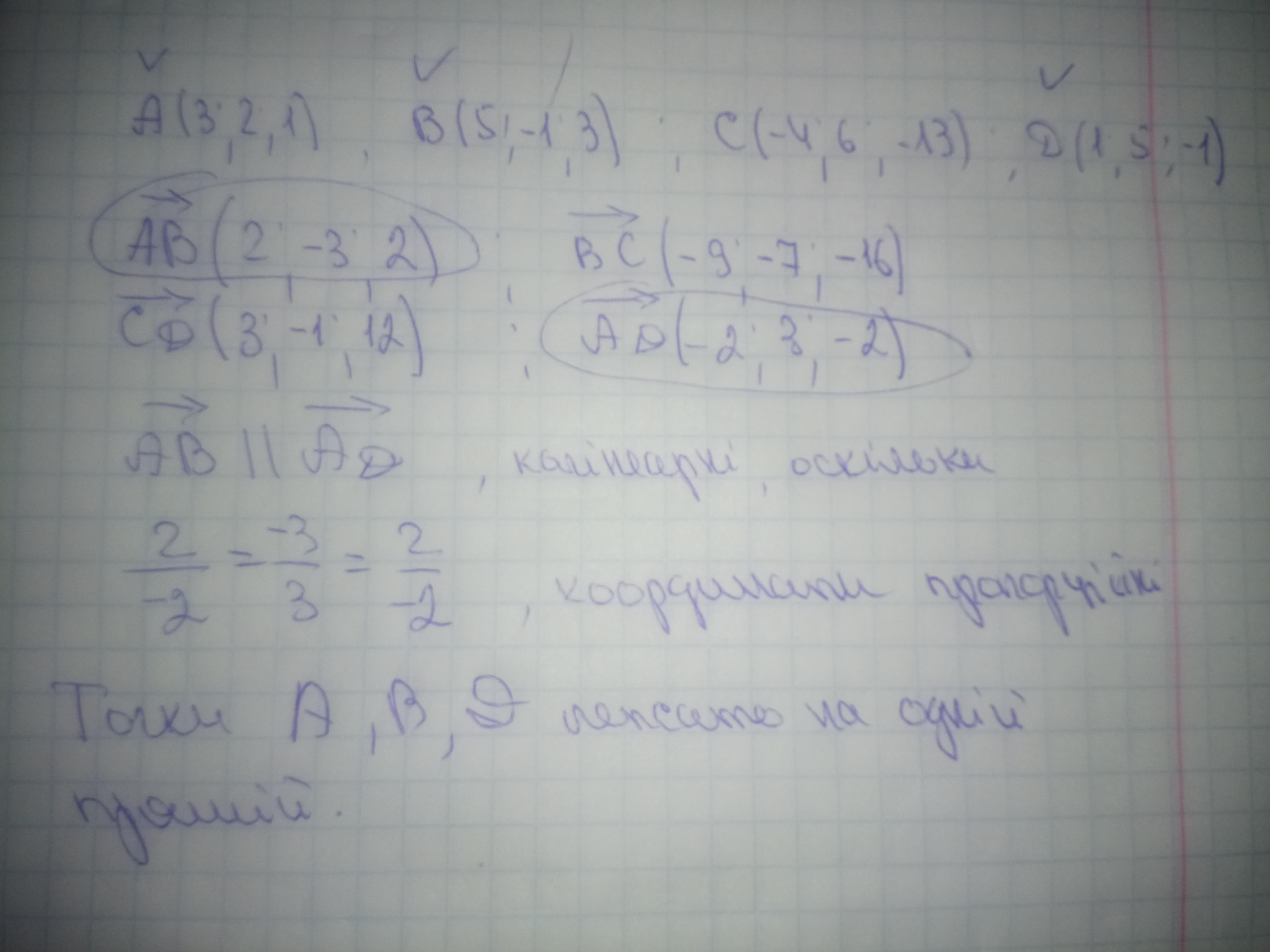 Які три з чотирьох точок лежать на одній прямій, якщо А(3;2;1), В(5; –1; 3), С(–4; 6; –13), D(1; 5; –1)?