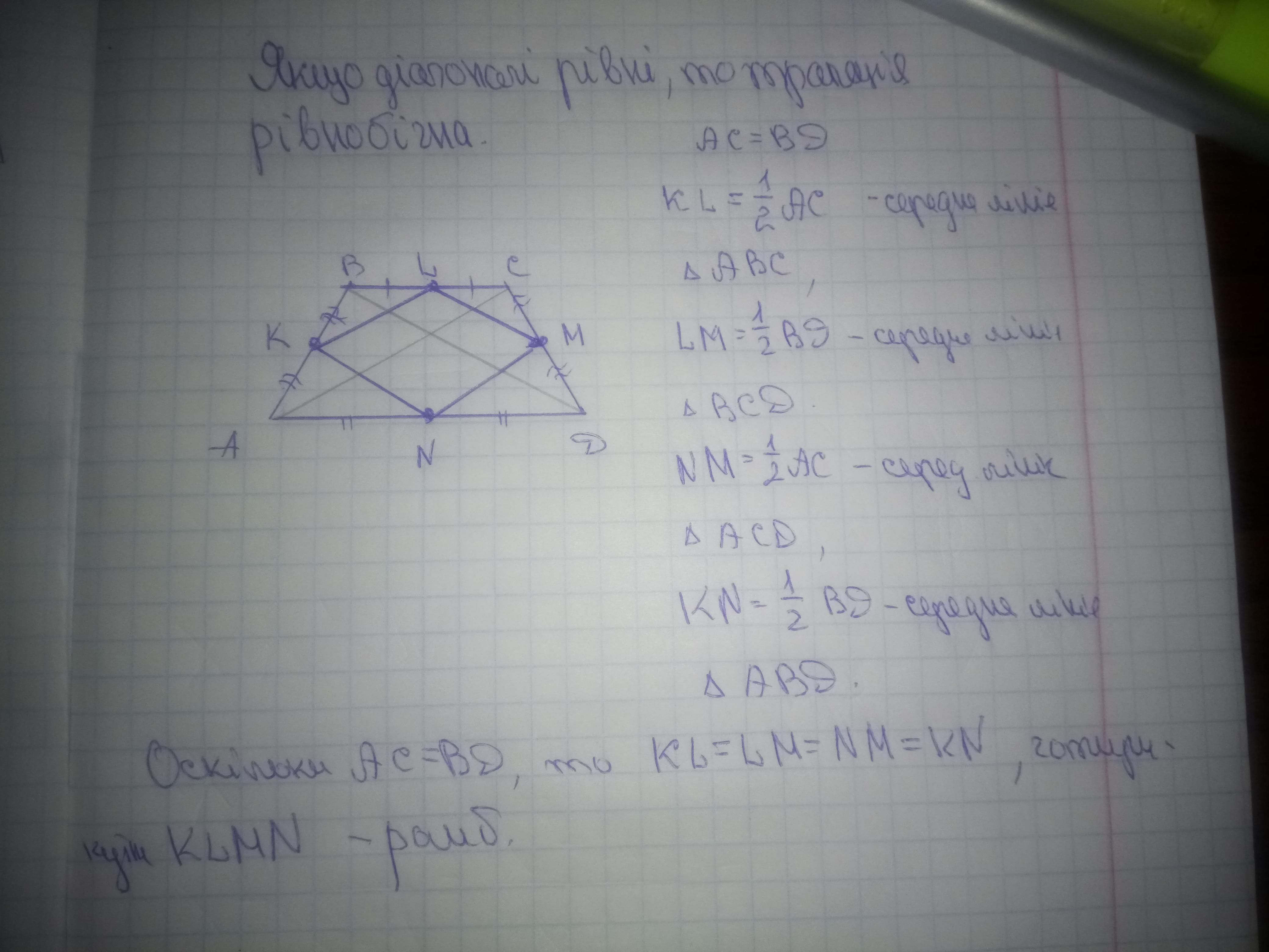Украинский, если что переведите на русский в переводчике. Послідовно сполучили середини сторін трапеції, діагоналі котрої рівні і не перпендикулярні. Яка утворилася фігура? Прошу объяснение и по желанию рисуночек, ну или набросок в Paint