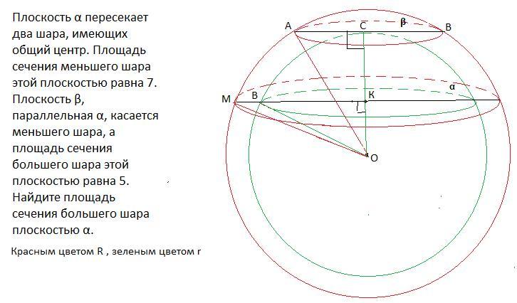 Плоскость α пересекает два шара, имеющих общий центр. Площадь сечения меньшего шара этой плоскостью равна 7. Плоскость β, параллельная α, касается меньшего шара, а площадь сечения большего шара этой плоскостью равна 5.(бедные дети) Найдите площадь сечения большего шара плоскостью α.