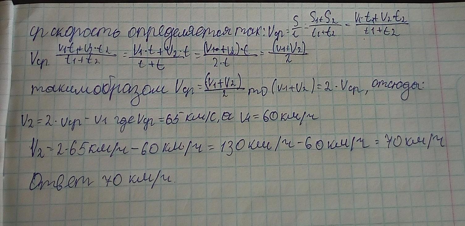 7. Половину времени движения из одного города в другой автомобиль перемешался со скоростью 60 км/ч. С какой скоростью он двигался во второй половине пути если средняя скорость автомобиля равна 65 км/ч