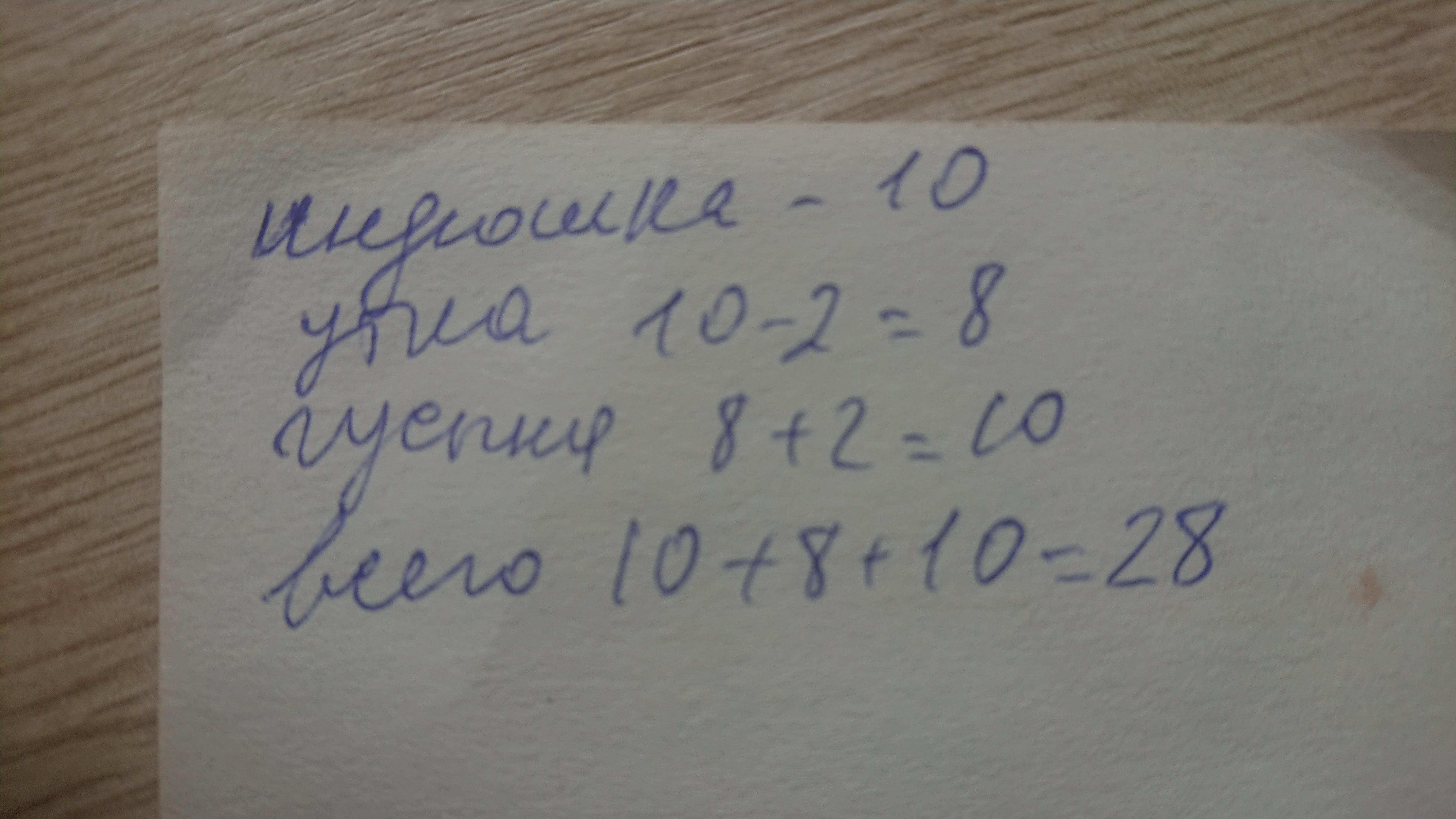 Индюшка высиживала 10 яиц,а утка на 2 яйца меньше.Гусыня высиживала на 2 яйца больше,чем утка.Сколько всего яиц высиживала индюшка,утка и гусыня