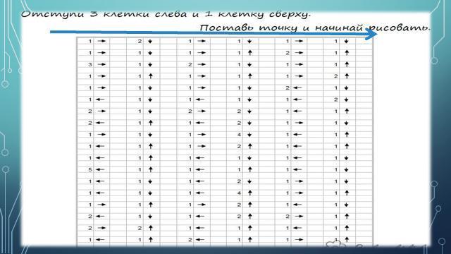 Здесь надо взять листик в клетку отступить 3 клетки слева и 1 сверху, а дальше по этим стрелочкам рисовать.Если на стрелочка вправо и на ней 5, то надо вправо нарисовать 5 клеток.
